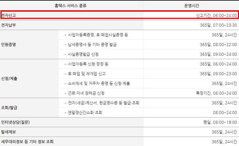 신고하실때 인터넷 국세청으로 하시면 주의해야할 사항이 전산망이 24시 이후에는 다음날 6시까지 안된다는 점입니다.