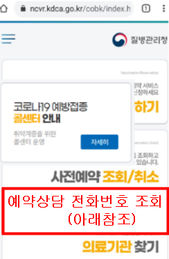 사전예약 시스템 홈페이지에서 서비스 접속대기 중입니다라는 창이 끝나면 '코로나19 예방접종 콜센터 안내'라는 메뉴가 있습니다.