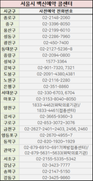 서울의 경우 아래에 제가 표로 사전예약 전화번호를 정리해놨으니 참고하세요.