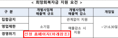 본인이 경영위기업종이 아니라면 아래 알려드리는 중소벤처기업부 홈페이지(mss.go.kr) 희망회복자금 보도자료 및 콜센터 1899-8300에 전화하셔서 물어보세요.