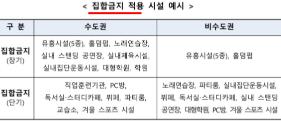 수도권과 비수도권에 따라서 집합금지 및 영업제한 업종이 분리됩니다.