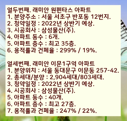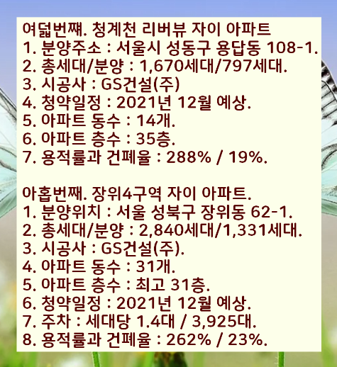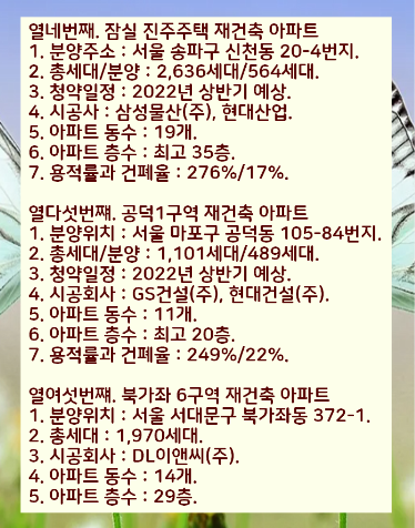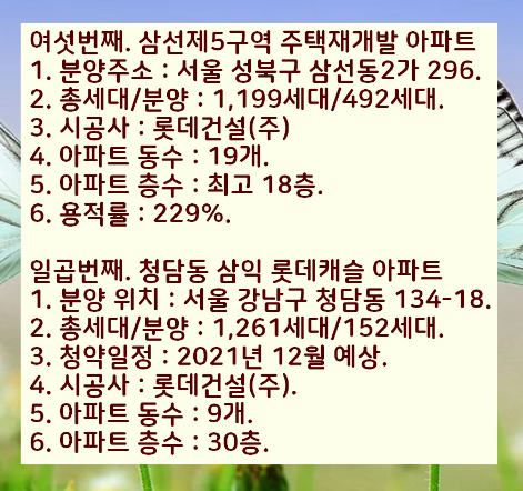 이렇게 서울지역에 강남과 서초구, 송파구, 마포구, 성북구, 성동구 등 다양한 분양가 상한제 적용지역의 아파트들을 소개해드렸습니다.