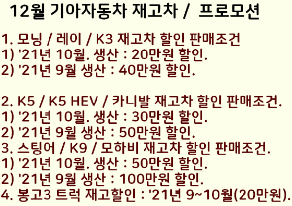 연말할인 행사로 기아 K5, 카니발, 스팅어, K9, 모하비도 재고차 할인을 진행하네요.