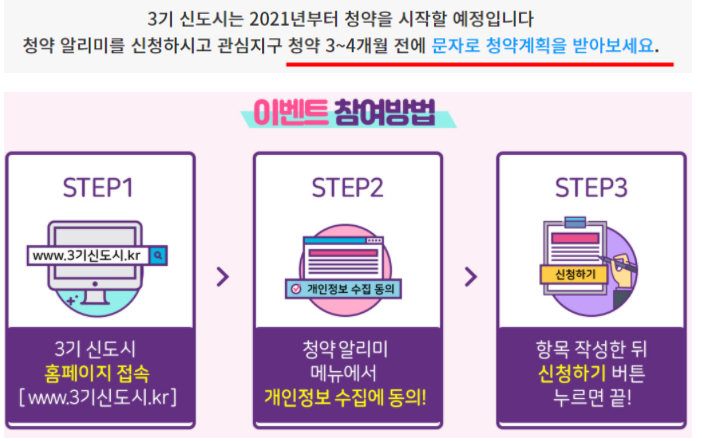 3기 신도시 청약 알리미를 신청하시면 본인이 청약 신청을 희망하는 지역의 분양일정 계획을 사전에 문자로 3~4개월전에 보내준다고 합니다.
