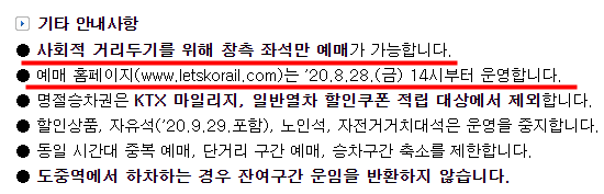 두번째로 중요한 사항은 사회적 거리두기 강화로 인해서 창측 좌석만 예매가 가능하다는 점을 참조하시기 바랍니다. 그렇기 때문에 이번 추석 기차표에 많은 사람들이 몰려서 예매 결제를 하기가 어려우실 수도 있습니다.