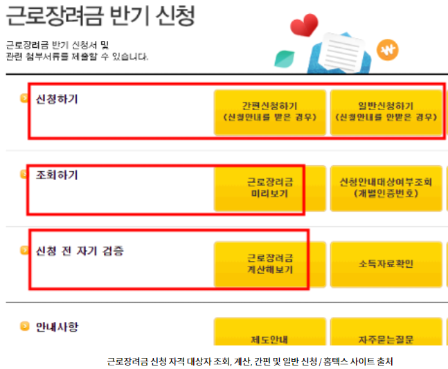 1. 국세첨 홈텍스의 근로장려금 신청 조회에서 미리보기를 하시면 간단하게 자격을 확인하실수 있습니다.