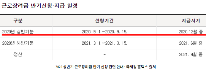 2020 근로장려금 신청시 지급시기는 그림에서 보다시피 상반기분에 대한 지급일이 12월입니다.