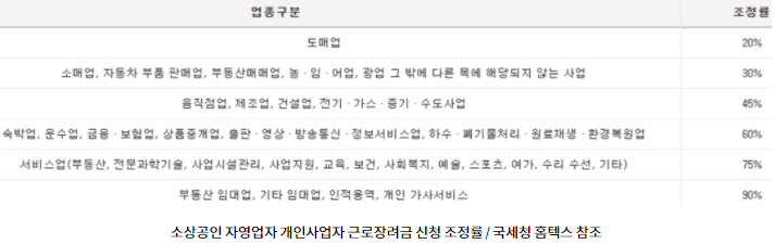 개인사업자의 경우, 매출이 순수일이 아니기 때문에 그리고 순수익에서도 실제로 남는것이 얼마 안되기 때문에 아래와 같은 업종을 구분해서 조정률을 거칩니다.