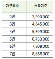 첫번쨰로 기준 중위소득 120% 이하로 소득조건을 충족해야합니다. 중위소득 120% 기준표를 올렬놨으니 보시고 본인의 소득수준을 참고하여 비교해보시기 바랍니다.