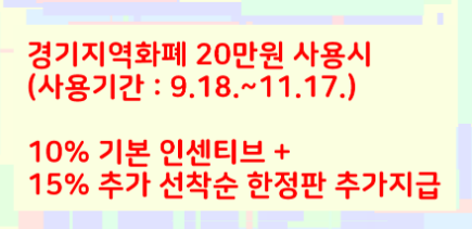 10%기본인센티브와 1%추가 소비지원금을 지급받으셔서 경기도민이시라면 꼭 경기지역화폐로 25%의 혜택을 보시기를 추천드립니다. 이번 경기지역화폐 이벤트는 한정적으로 운영하는 재난지원금같은 복지로 선착순으로 신청해서 충전해서 이익보실수있습니다. 그러니 늦지말고 미리미리 잘 알아보시기 신청방법 참고하셔서 추석전에 접수하시기 바랍니다.