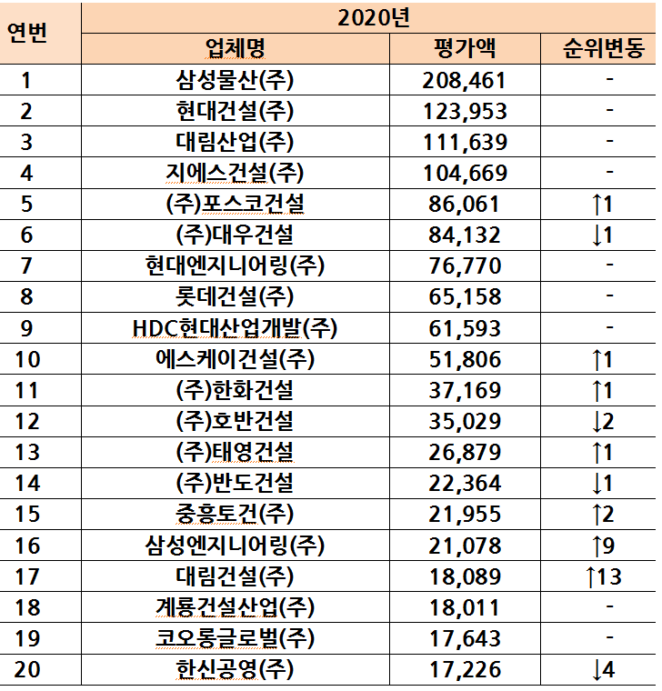 국토교통부(장관 김현미)가 전국 건설업체를 대상으로 공사실적, 경영상태, 기술능력, 신인도 등을 종합평가한 ‘2020 시공능력 평가’ 결과, 토목건축공사업에서