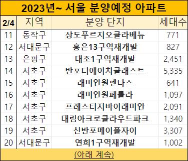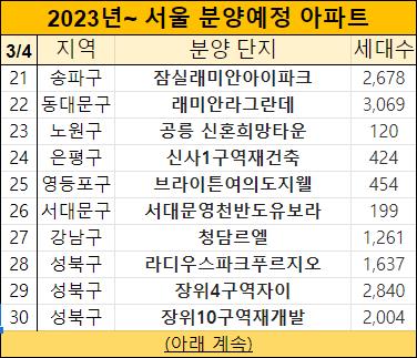 이렇게 2023년까지 서울에 분양예정인 아파트들을 표로 정리해서 알려드렸습니다.