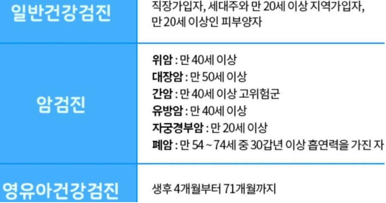 꼭 해당 항목 건강검진 대상 나이에 속하지않아도 기본적으로 건강보험이 적용되는 항목이 있습니다.