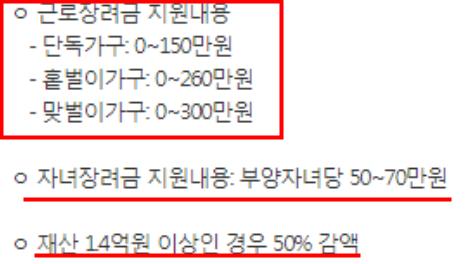 그리고 위에서 알려드린대로 근로장려금 신청자격 요건중에서는 재산사항이 있는데 2억원까지만 갖고 있어야합니다. 또한 1억4천만원 이상시에는 지급액이 50%가 감액되는 것을 참조바랍니다.