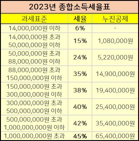 2023년에 개정된 내용으로 과세표준구간 1,400만원 이하와 5,000만원 이하 구간이 바뀌었습니다.