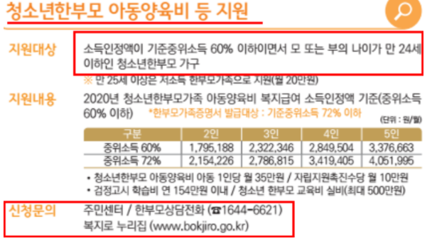 청소년한부모의 경우 중위소득 구간을 62~72%로 완화한 자격조건으로 만24세 이하인 부모님은 신청 가능합니다.