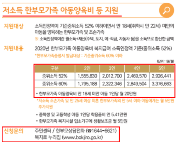 각 가구원 수별로 중위소득 52~60%를 이내의 저소득층 한무보가족은 아동양육비를 신청할수있다고 합니다.