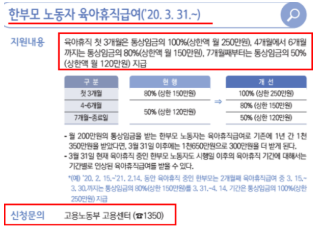 한부모가정 육아휴직급여 문의는 고용노동부 고용센터인 1350으로 전화해서 상담을 받아보시기를 바랍니다. 자격조건을 충족한다면 꼭 지원혜택을 받으시기를 추천드립니다.