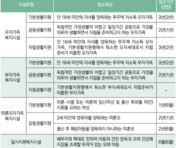 모자, 부자, 미혼모자 가족 복지시설 지원