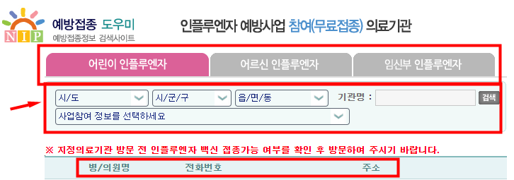 뜸들이지않고 바로 사이트 알려드렸습니다. 아래 그림에서 보시다시피 어린이, 어르신, 임산부 독감 무료 접동 대상자별로 지정병원 조회가 가능합니다. 자세한 내용은 밑에서 참조하시기 바랍니다.