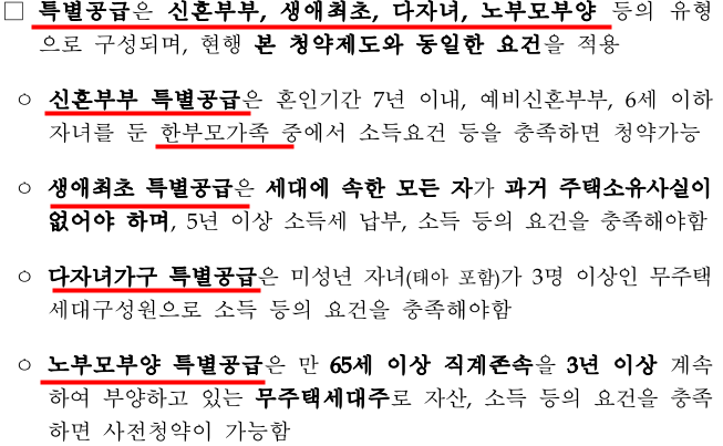 이렇게 다양한 무주택자를 위한 낮은 분양가와 경쟁률 청약으로 지원할수있는 아파트 특별공급이 있습니다. 신혼부부, 생애최초, 다자녀가구, 노부모부양, 한부모가정 특별공급 청약 전형을 많은 무주택자분들이 아셨으면 좋겠습니다.
