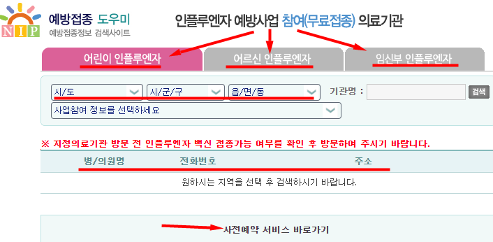 그러면 병원 주소를 확인하고 전화해서 예약가능여부를 상담받아봅니다. 혹은 독감 무료 예방접종 사전예약 서비스를 이용합니다.