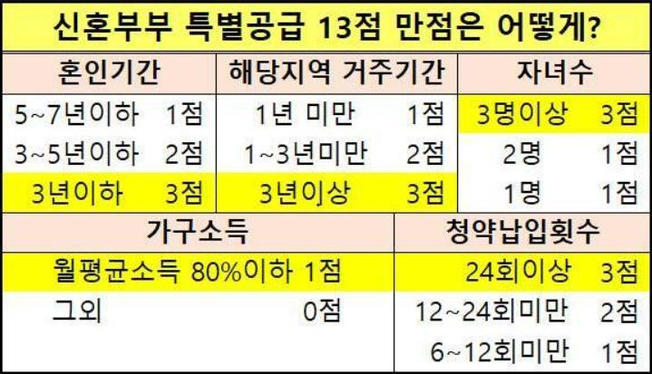 신혼부부 특별공급 가점은 13점이 만점입니다.