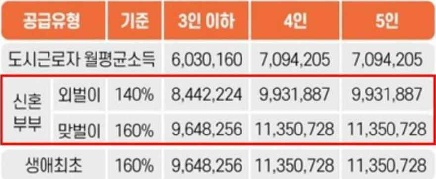 3. 도시근로자 월평균소득 140% 이하(맞벌이 160% 이하).