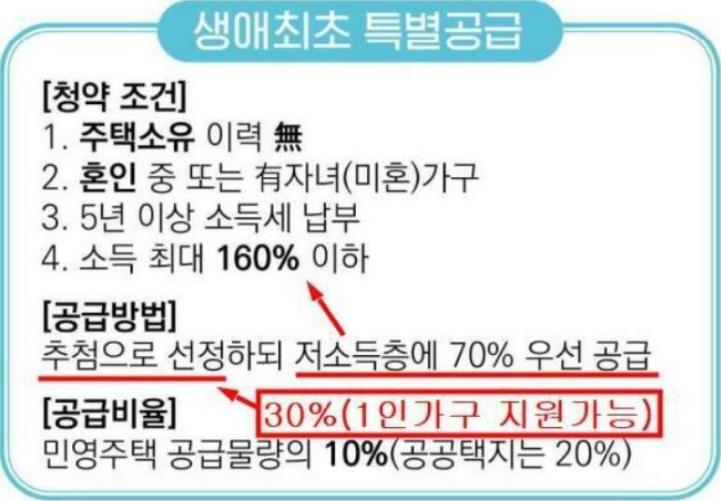 4. 생애최초 특별공급 30% 물량만 1인가구도 추첨으로 당첨될수있습니다.
