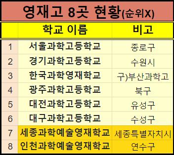 위에서 알려드린 세종과학예술영재고, 인천과학예술영재고등학교는 새로 만들어진 영재고입니다.
