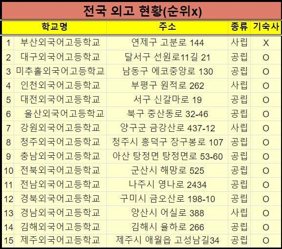 이렇게 전국에 있는 외국어고등학교 리스트로 만들어서 알려드렸습니다.