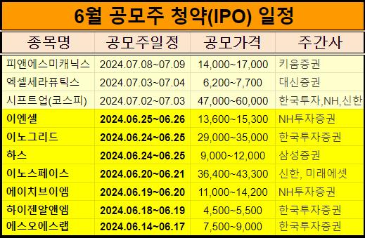 이렇게 2024년 6월 공모주 청약일정표를 첨부해서 알려드렸습니다.