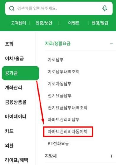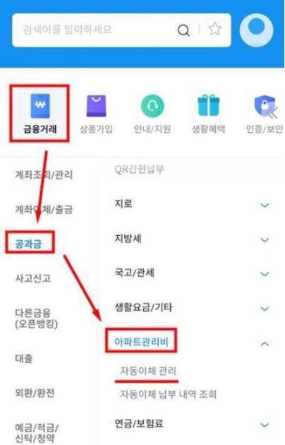 두번째. 공과금에 보시면 아파트 관리비 메뉴가 있습니다. '자동이체 관리'를 선택해서 변경하시면 됩니다.