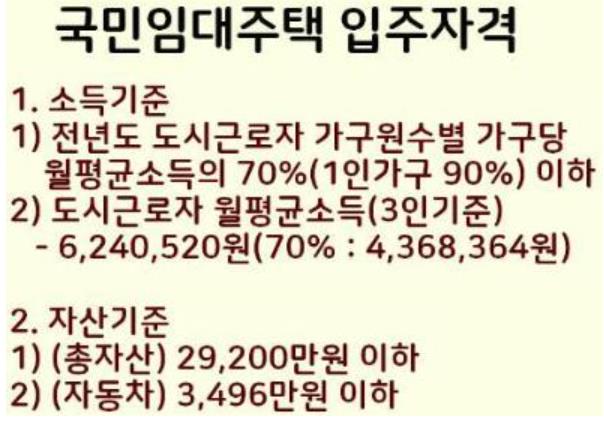 국민 임대아파트 입주시 월평균 소득기준표를 참고하세요.