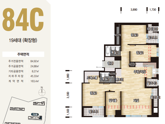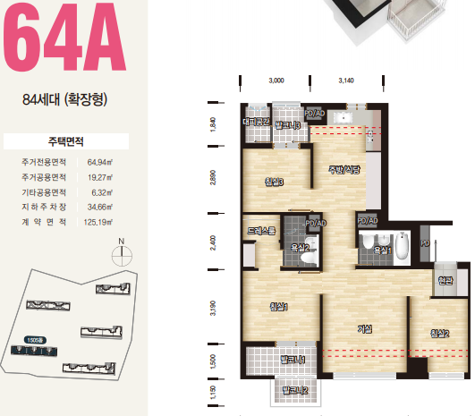 64형의 평면도는 84세대수를 지원하며, 신혼부부나 2~4인가족분들에게 추천드립니다.