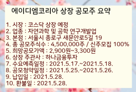 수요예측일인 2021년5월17일을 기억해두었다가 공모가격과 기업들 청약경쟁률 등을 확인하셔서 꼼꼼하게 잘 알아보고 공부해서 에이디엠코리아 상장 공모구 IPO 청약을 진행하시기 바랍니다.