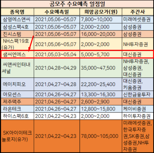 샘씨엔에스 청약일정은 2021년 5월10일부터 5월11일까지 2일동안 진행합니다.