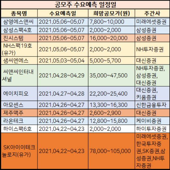 위에서 말씀드렸다싶이 2021년 4월 공모주 수요예측일정을 청약일정보다 먼저 살펴봐야합니다.