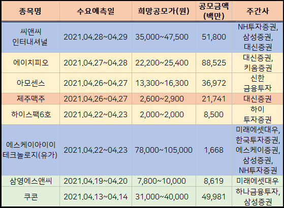 4~5월 공모주 수요예측일정도 표로 정리하여 첨부해드렸습니다.