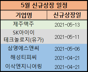 그리고 마지막으로 4월, 5월 공모주 신규 상장주 상장일도 남겨드립니다.