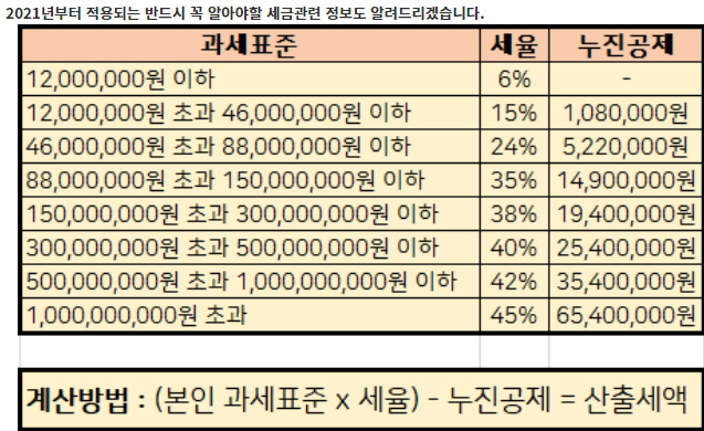 2021년 종합소득세율표는 아래처럼 10억원 초과 구간 45%가 신설되었습니다. 종합소득세 신고기간는 5월이며, 신고방법과 계산방법, 종합소득세율표를 아래 첨부하였습니다. 2021년부터 적용되는