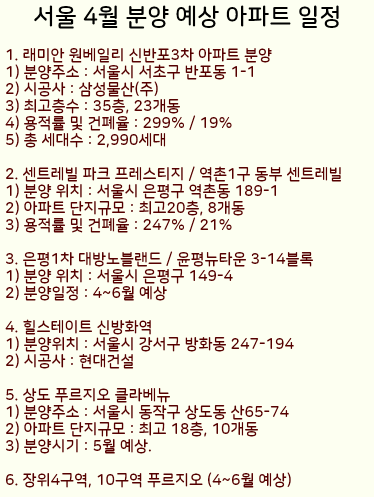 3. 서울 4월 아파트 분양 예정인 순서대로 정리하였습니다.