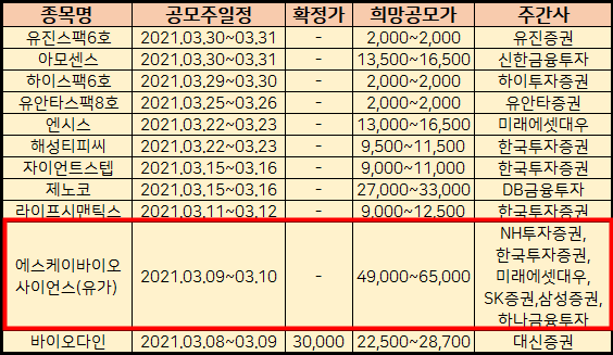 * Sk 바이오 사이언스 청약일정은 3.9.~3.10.입니다.