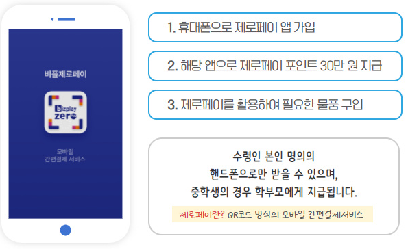 우선 중학교 1학년과 고등학생 1학년에게 30만원 상당의 제로페이를 포인트로 지급합니다.