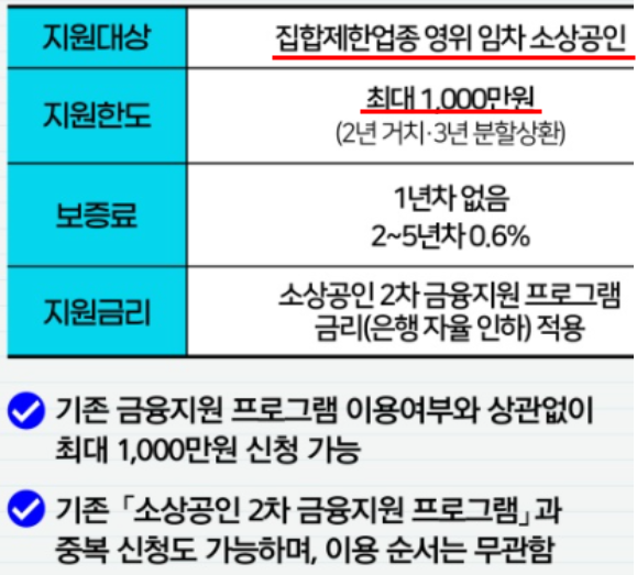 다른 소상공인 2차 금융지원 프로그램과 중복신청이 가능하며, 최대 1,000만원 신청이 가능합니다.