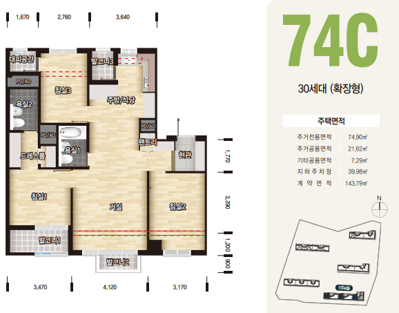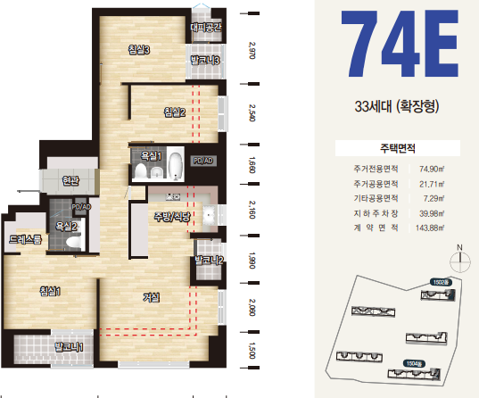 74D형의 경우 20세대수로 희귀한 물량이며, 방이 나란히 있으면서 마찮가지로 중간에 주방과 거실이 껴있어서 단란한 가족생활이 가능할것으로 보입니다.