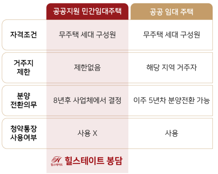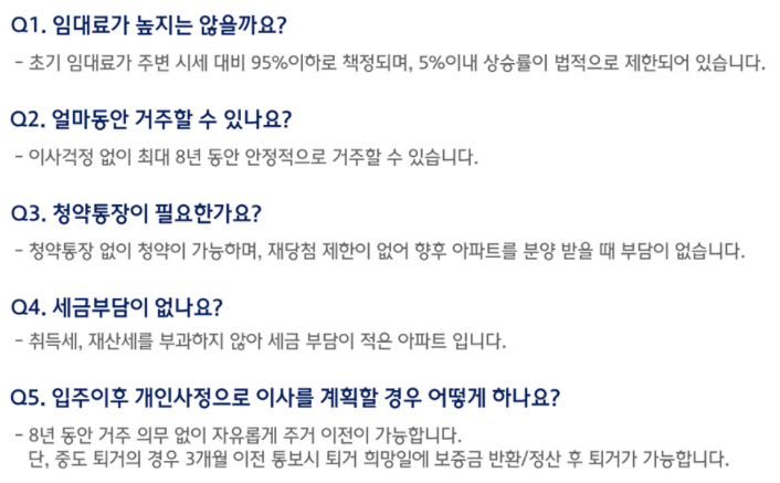 그 이외에는 설명드린것처럼 청약통장을 사용하지 않는다는점과 거주지 제한조건이 없다것과 분양 전환의무가 8년후에 사업체에서 결정하게 된다는 특징이 있습니다.