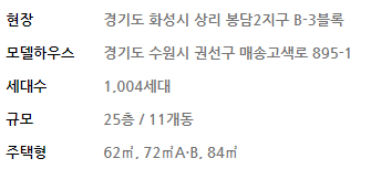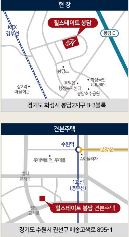 현장 주소는 경기도 화성시 상리 봉담2지구 B-3NL이며 견본주택의 주소는 경기도 수원시 권선구 매송고색로 895-1에 위치해 있습니다.