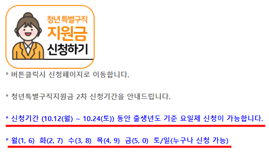 그래서 청년 특별구직지원금 2차 접수는 10.12.~24.로 12일 동안 신청하실수 있습니다.