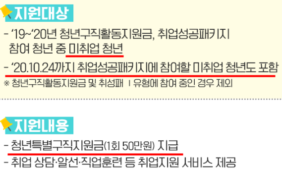 첫번째로 19년~20년에 청년구직활동지원금이나 취업성공패키지 참여중중인 미취업 청년을 대상으로 합니다.